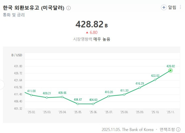 연합뉴스에 따르면, 2025년 11월 5일 한국은행은 10월 말 기준 우리나라 외환보유액이 4천288억2천만달러로, 8월 말보다 68억달러 증가했다고 밝혔다고 한다.